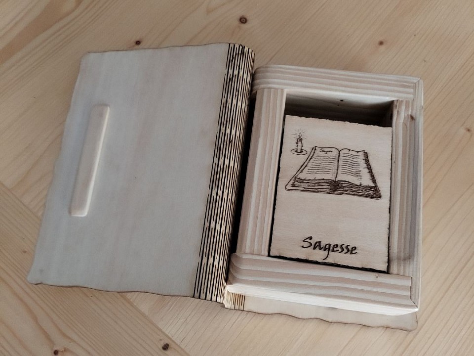 Jeu de 25 cartes en bois gravées et vernies dans un coffret (en option).